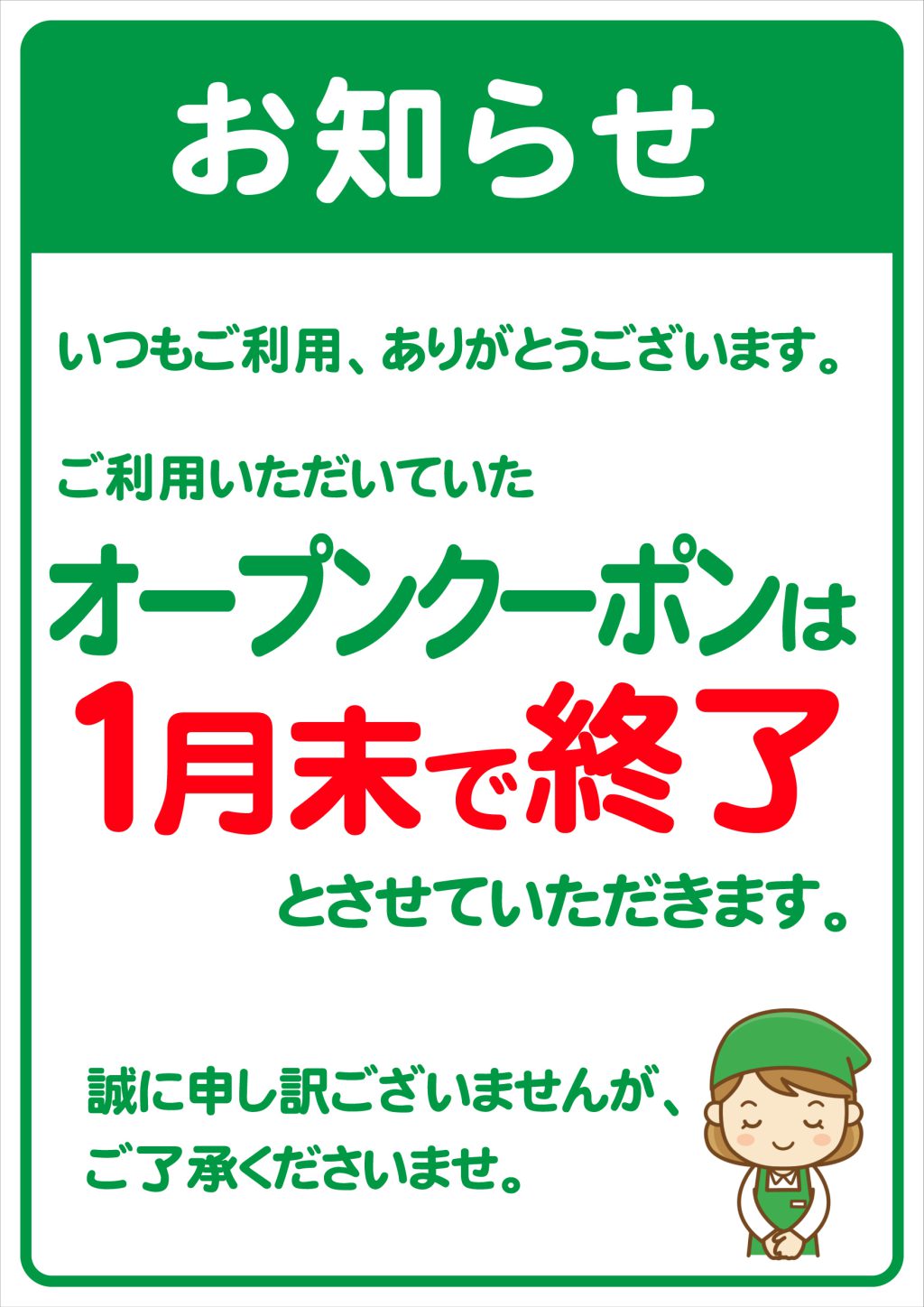 このたび、誠に勝手ながら、2026年1月末をもちまして、スマートフォンアプリ「オープンクーポン」のサービスを終了させていただくこととなりました。